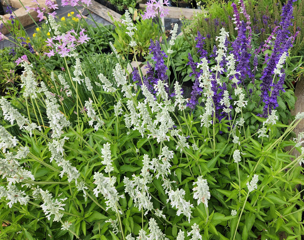 Salvia ‘Augusta Duelberg’ is a cultivar of Mealycup Sage. Despite its delicate look, this Texas native perennial can handle our extreme weather. If trimmed periodically, it comes back refreshed and thicker and reblooms. It is drought, heat, and sun tolerant, and about the only thing it cannot handle is wet feet. It does break fairly easy, so plant it away from high-traffic or windy areas. Salvia ‘Augusta Duelberg’ makes an excellent plant for perennial gardens and mass planting, with blooms that attract bees, butterflies, and hummingbirds.