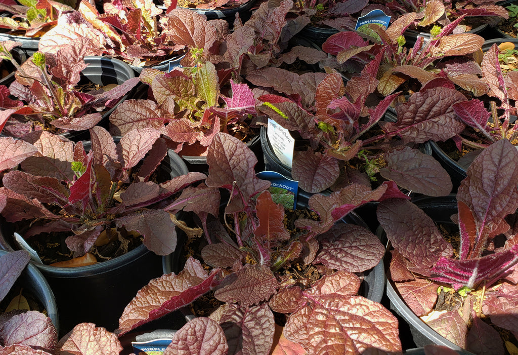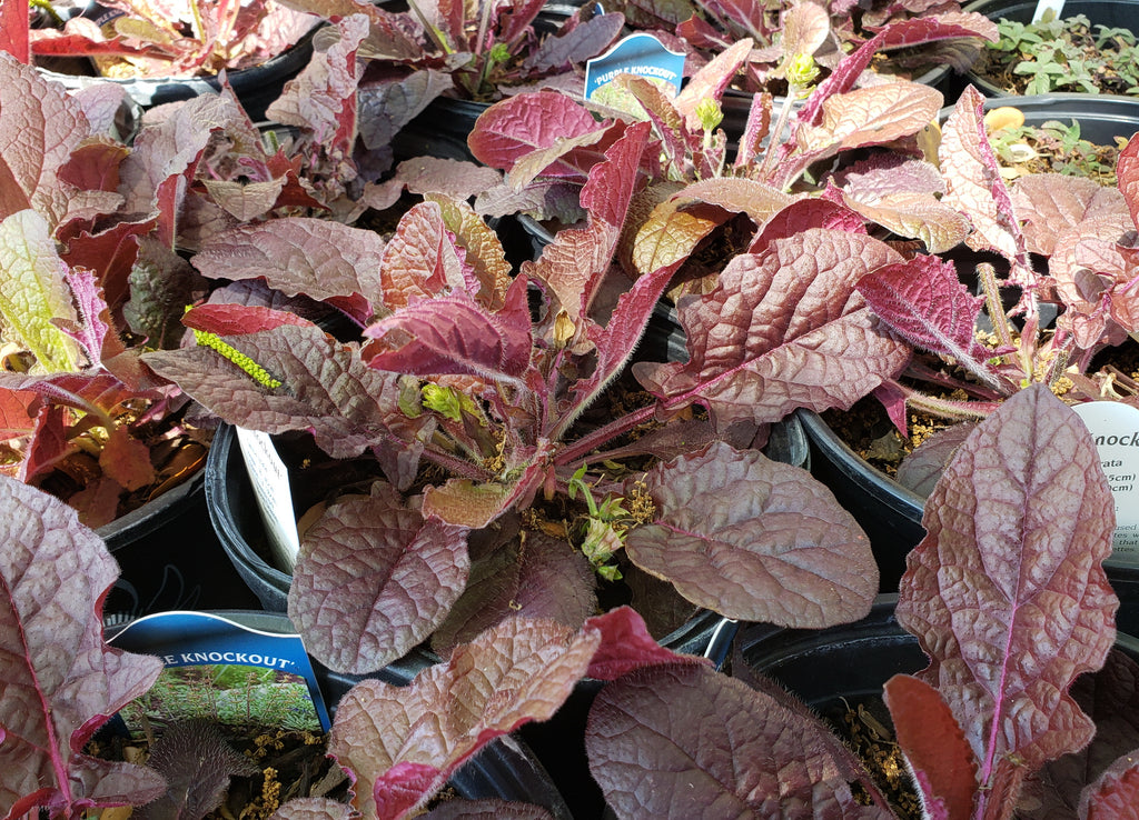 Lyreleaf Sage 'Purple Knockout' has burgundy leaves that turn to deep purple in summer, then to red in the fall. Spikes of pale lilac-blue flowers appear in spring and summer, but sometimes the flowers have only calyces and no petals. Petals or no, the flowers are attractive to bees and butterflies. It makes a great native substitute for Ajuga.